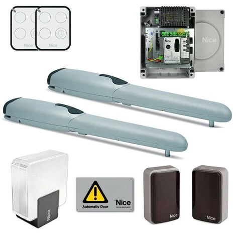 KIT Porte battante NICE WINGO à 2 portes jusqu’à 2 mètres de longueur, alimentation 24V, avec montage externe et technologie bidirectionnelle.